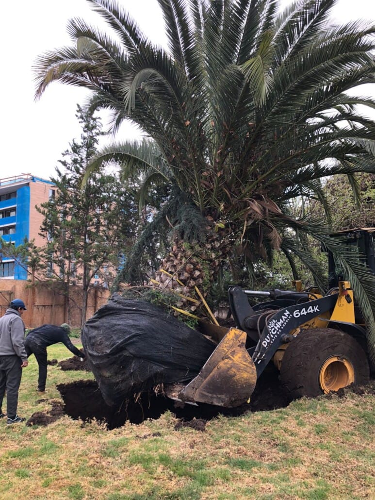 Les arbres déplacés sont sept platanes d’Orient, deux acacias, un palmier chilien et un chêne américain. Tout d’abord, un périmètre de 2 mètres a été délimité manuellement autour de chaque arbre, ameublissant le sol autour de celui-ci. Une machinerie spécialisée a alors été mise en action, équipée de pinces hydrauliques capables de perforer le sol pour retirer l’arbre de ses racines, le soulever et le déplacer en douceur vers un nouveau site préalablement creusé et traité avec des agents d’enracinement qui aideront l’arbre à générer nouvelles racines.